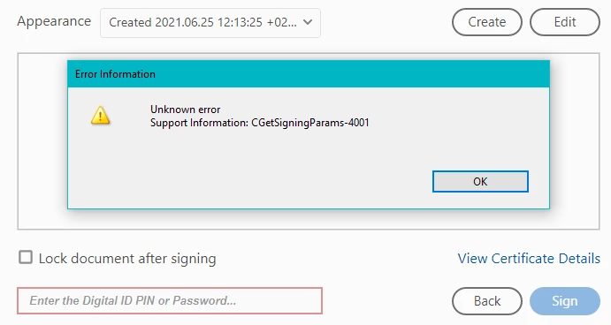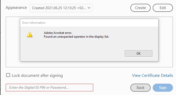 Digital Signature Error: Found an unexpected operator in the display list CGetSigningParams 4001