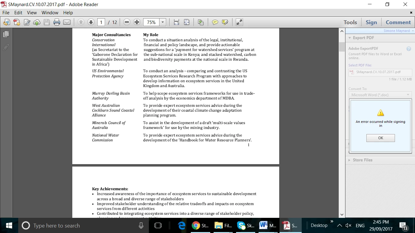 I am tying to convert a PDF document to a Word document. When doing so, a blue box pops up on the right hand side saying 'error when signing in'. I have changed my password twice now and signed into Adobe with no problem. I have also tried accessing the converter through different browsers. This box only pops up when I am trying to convert to Word (or edit a PDF). See screen shot.