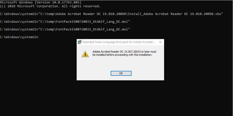 I'm using a Win10 64 bit machine (Virtual) with Acrobat reader DC v19, I have tried to install the Extended Asian Language font pack on the same, unfortunately it's throwing an error while running, (Adobe Acrobat Reader Dc 15.007.20033 or latest must be installed before proceeding with this installation), Can you please provide me a resolution for this or give me the latest font pack which will support Acrobat Reader DC v19.