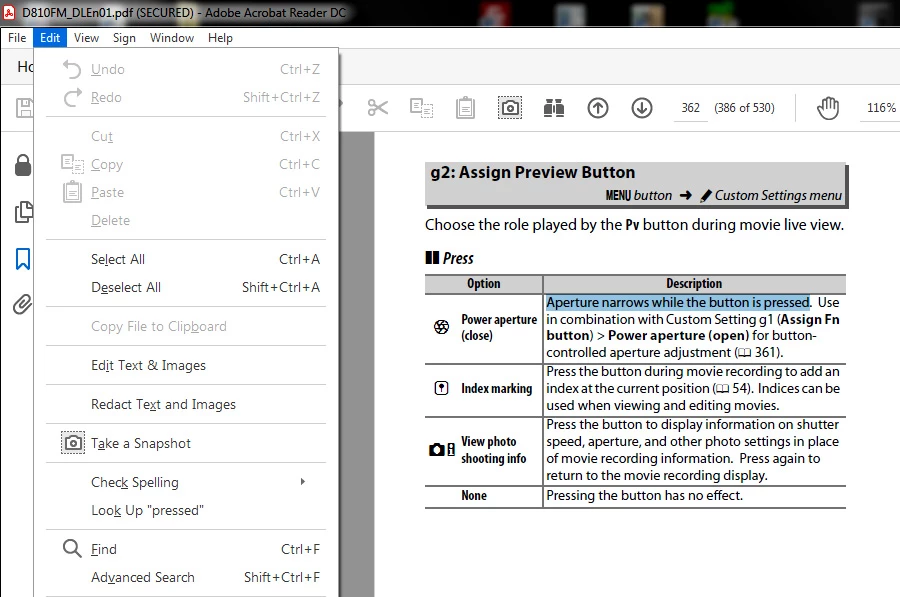 If I select text in a PDF file the Copy option in the Edit menu repaims grayed-out and Ctrl+C does nothing. The example shown here is from the owner's manual for the Nikon D810 camera.