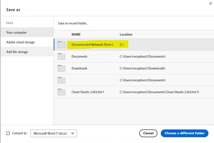 Network drive is marked as disconnected when save a file in Adobe Acrobat
