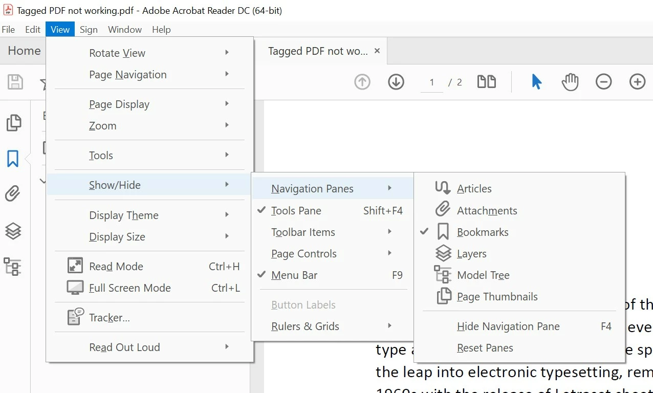 I'm investigating making more accessible PDFs. However, I don't seem to have a Tags option or panel in my Adobe Acrobat DC. As described on the Adobe website, it's meant to be enabled at View > Show/Hide > Navigation Panes > Tags: