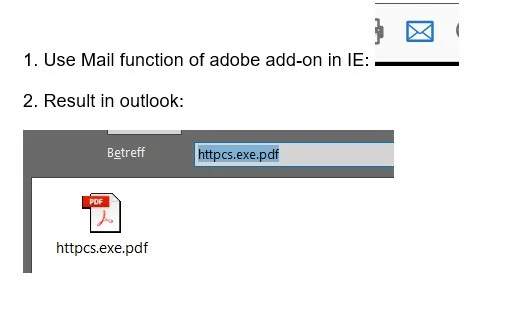 we open an invoice original (which is a pdf-file). The PDF is opened in internet explorer add-on for adobe reader (Version 17.8.30051.224877). Within the add-on, we use the function to attach the PDF as an attachment to an outlook email. Unfortunately, the PDF-attachment of the outlook-mail is created with a very strange file name which contains the string "exe": "httpcs.exe.pdf ".