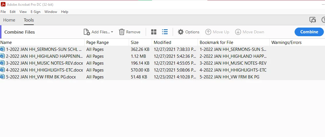 2. In Adobe Reader, I selected all the files, then clicked on "Combine":