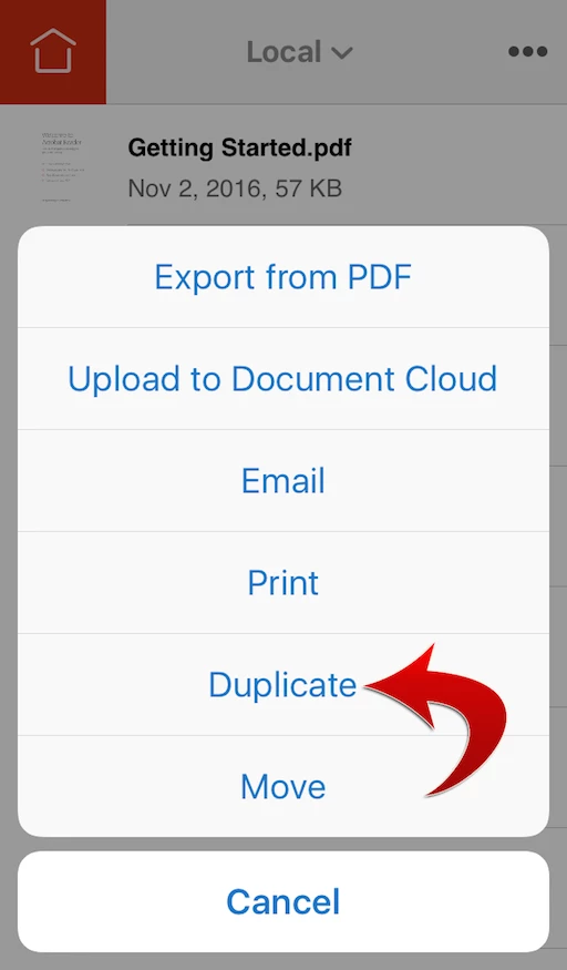 Please note that duplicating a file in the cloud storage (e.g. Document Cloud, Dropbox) is not supported in Acrobat Reader for iPhone and iPad.