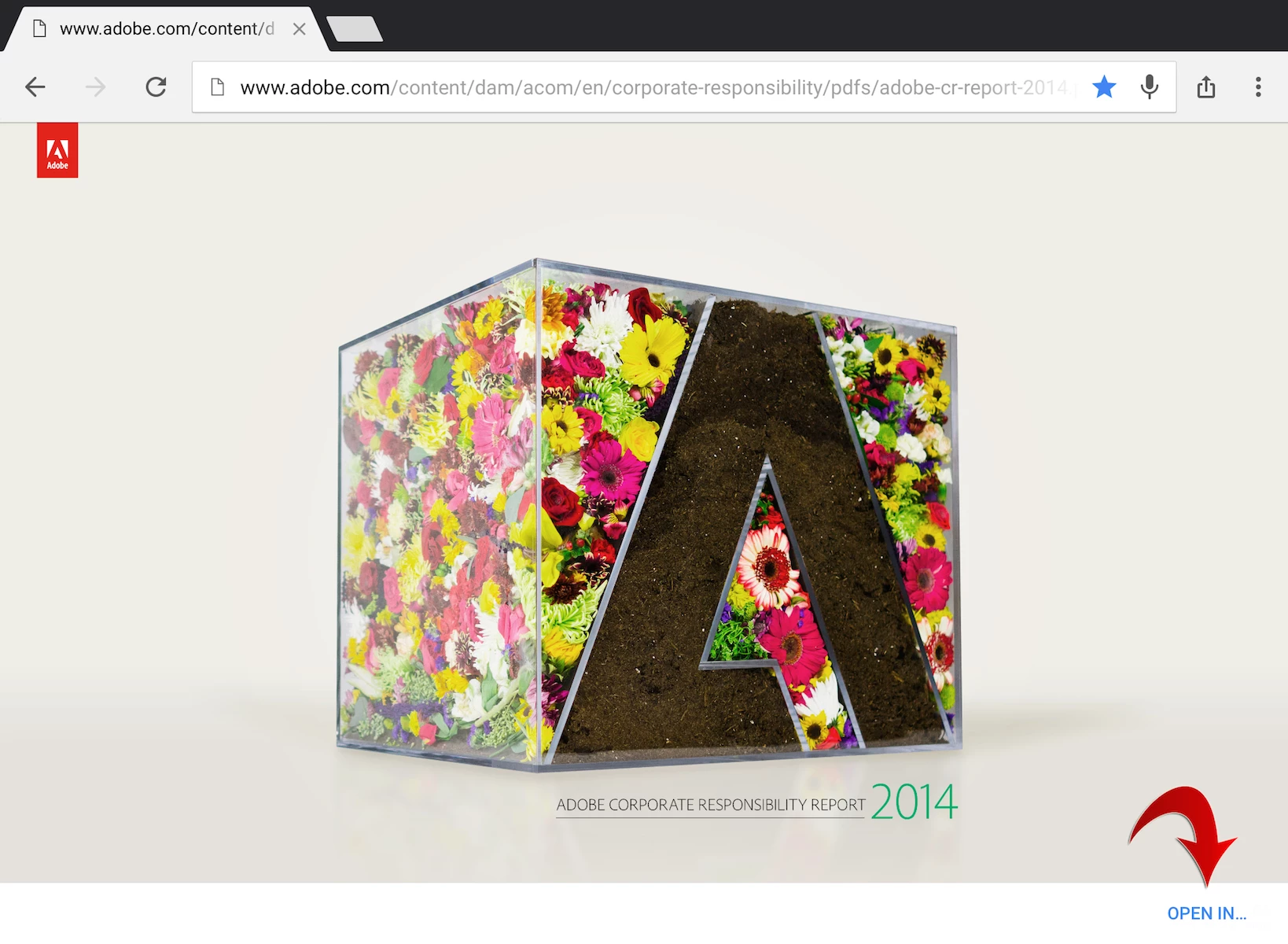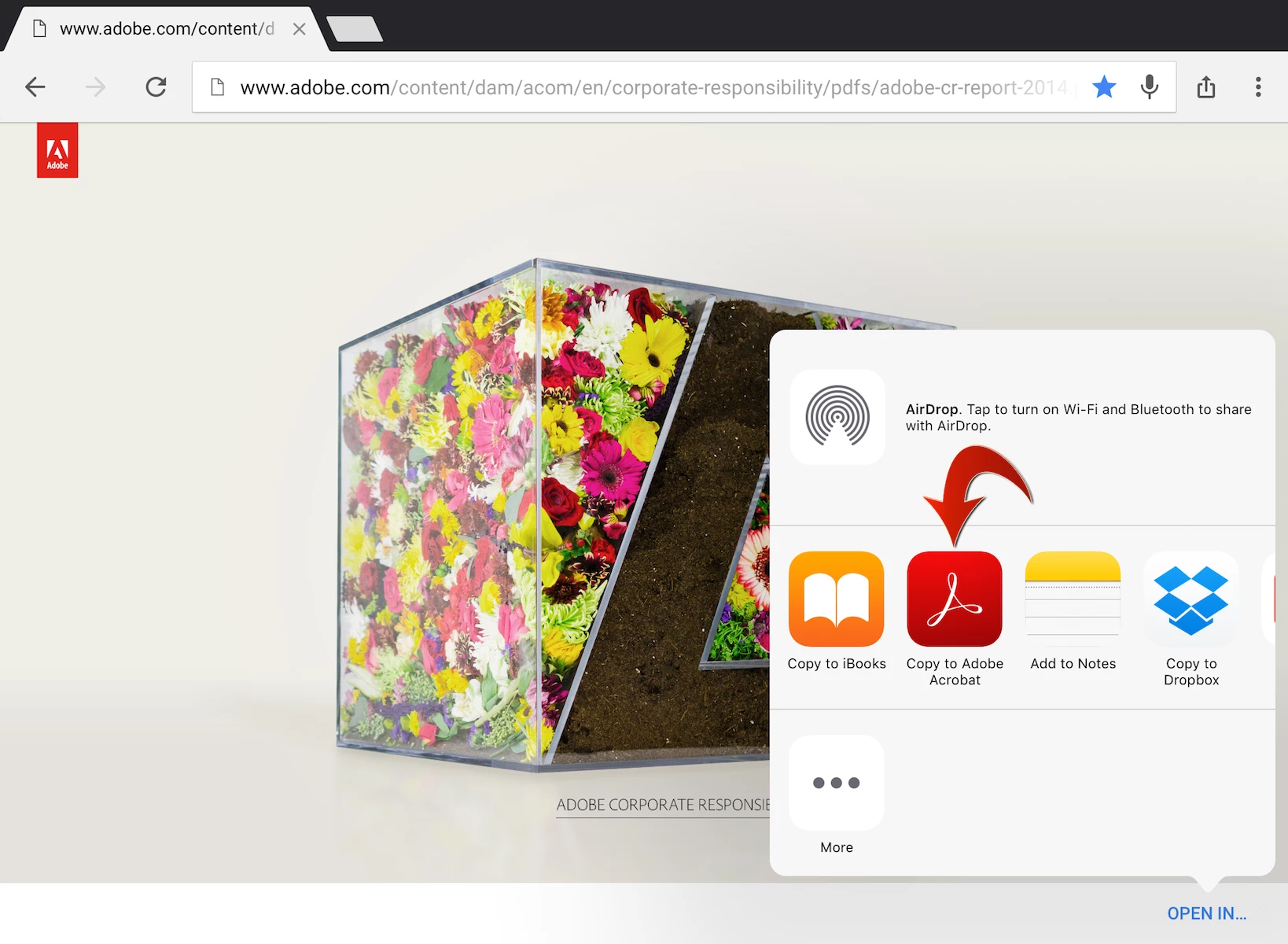 Please note that tapping the Share icon in Google Chrome's top toolbar does not show the "Open in" option for Acrobat Reader for iOS.
