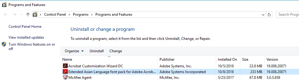 How do I uninstall the FontPack1900820071_XtdAlf_Lang_DC? I've tried uninstalling Adobe DC and looking through the Program Files without success.