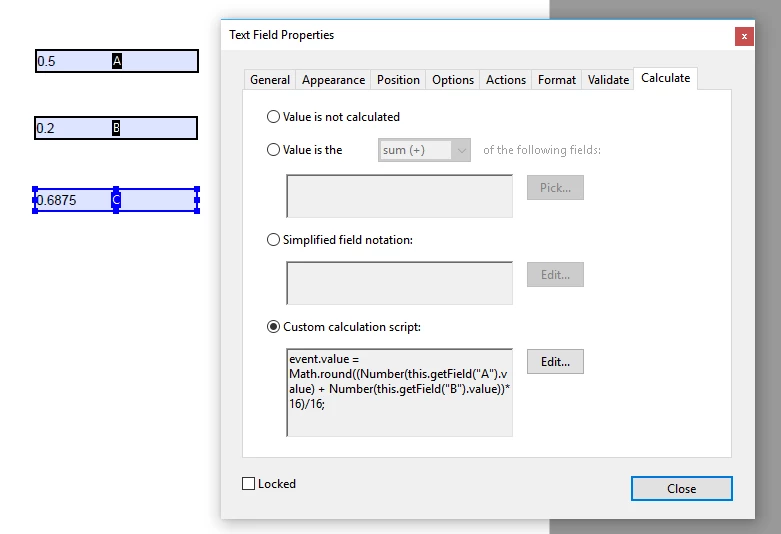 this.getField("C").setAction('Calculate', "event.value = Math.round((Number(this.getField(\"A\").value) + Number(this.getField(\"B\").value))*16)/16;" );
