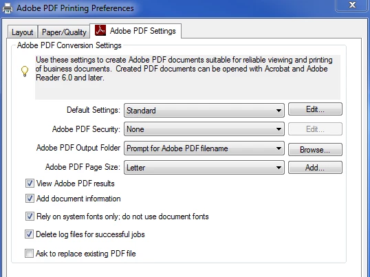 I Installed Acrobat XI Std with all of the current updates, but when I try to use the Adobe PDF printer the settings, security, and output folder fields are blank, instead of like this image.
