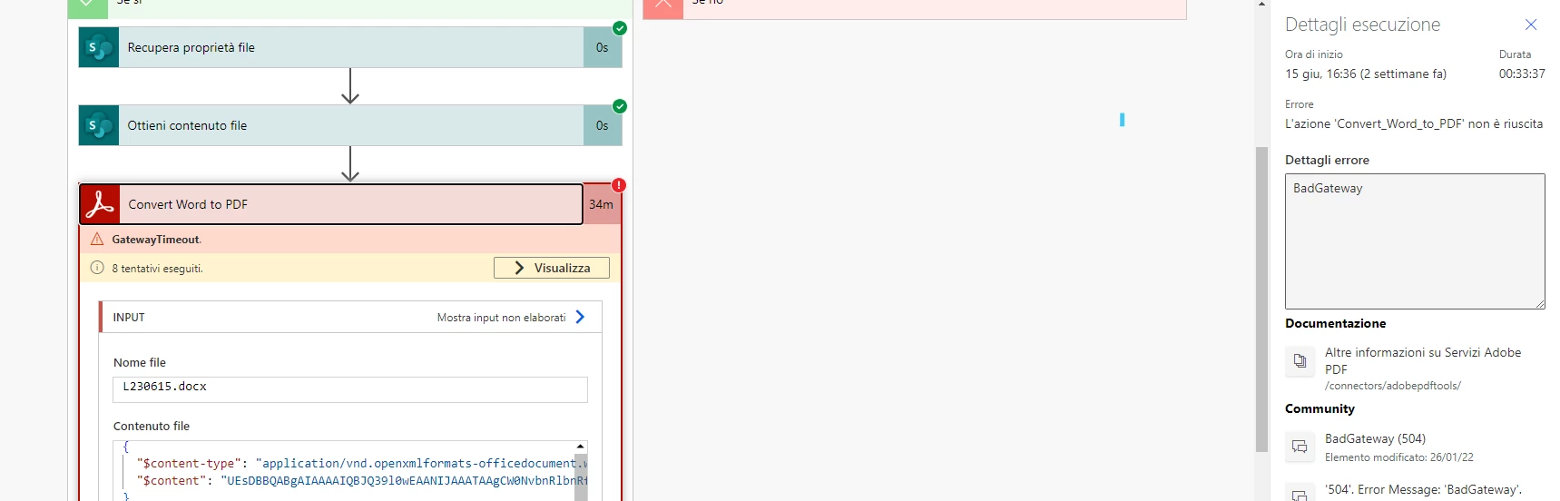 When converting a Word document to PDF, it tries 8 times to connect to the Adobe service and ends with Bad Gateway error.