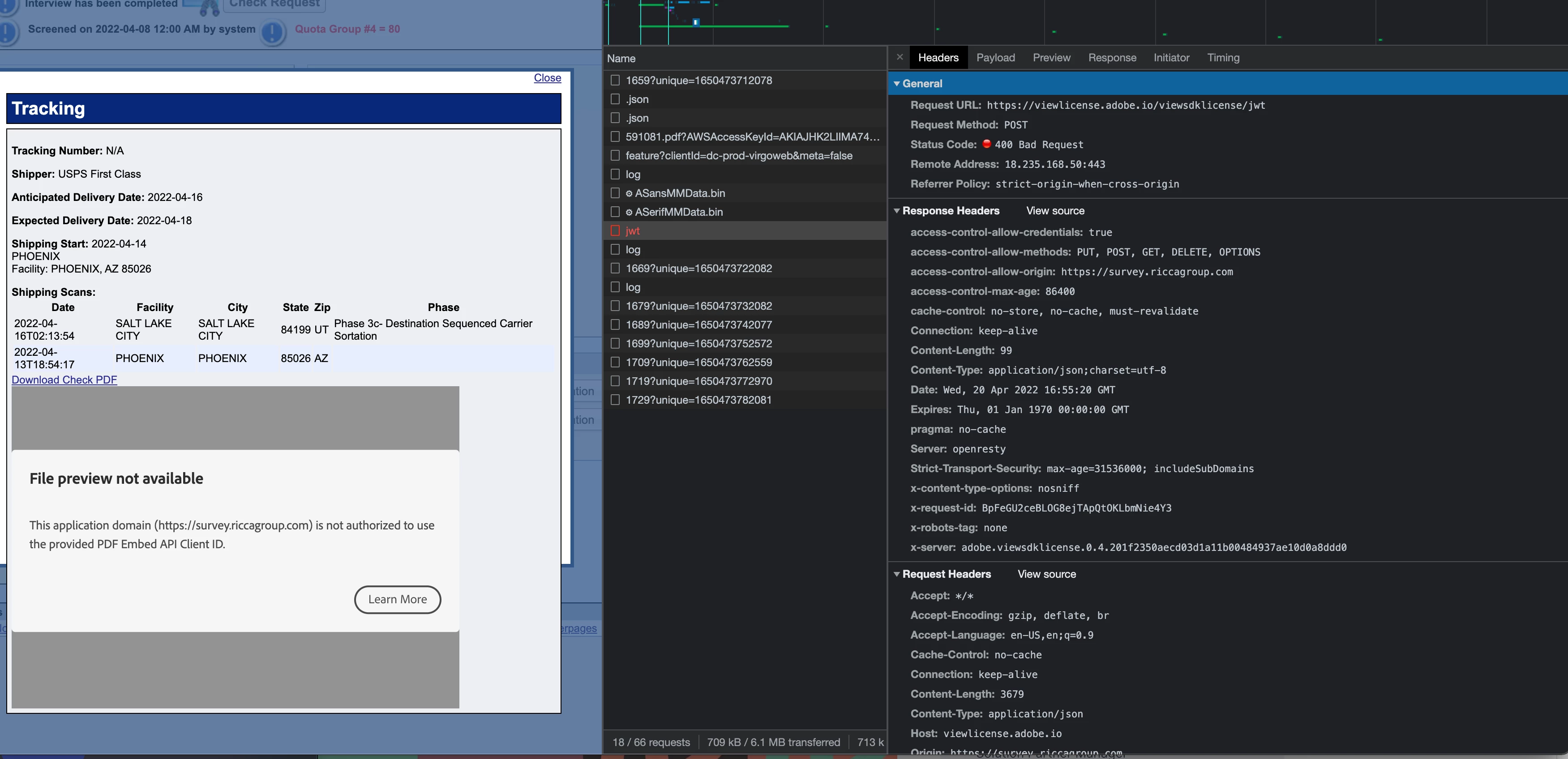 After it loads a call is made to https://viewlicense.adobe.io/viewsdklicense/jwt which then returns a 400 error and throws the error. It does not seem to matter where there PDF content is hosted, it just always throws a domain authorization error. I've tried multiple domains with the same result. Anyone else having issues with this?