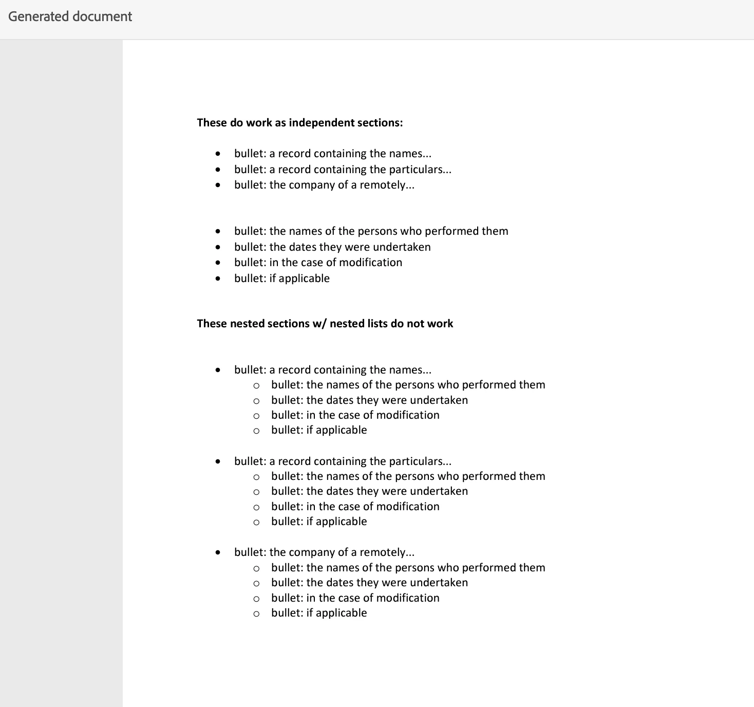 I have a document generation issue. I'm using MS Word and the document generation add-on to build / test document automation. I'm seeing a use-case that is not working for me. It is best outlined w/ this json: