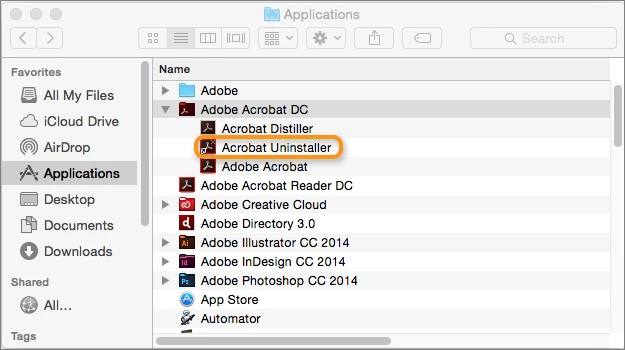 - Go to Finder > Applications > Adobe Acrobat DC, and double click the Acrobat Uninstaller.