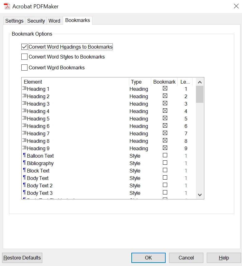From the ACROBAT preferences in Word>Select Bookmarks Tab> Under Bookmarks options, select all the three checkboxes.