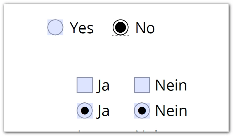 Problem: it's a German document with "ja" and "nein" – these German labels are mistakenly recognized by Acrobat as check boxes and not as radio buttons if it would have the English Labels "yes" and "no" 😞