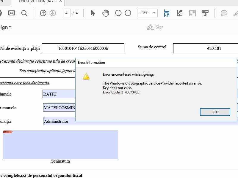 when i try to sign a documet  using Acrobar Reader DC (Windows10) i receive this message: