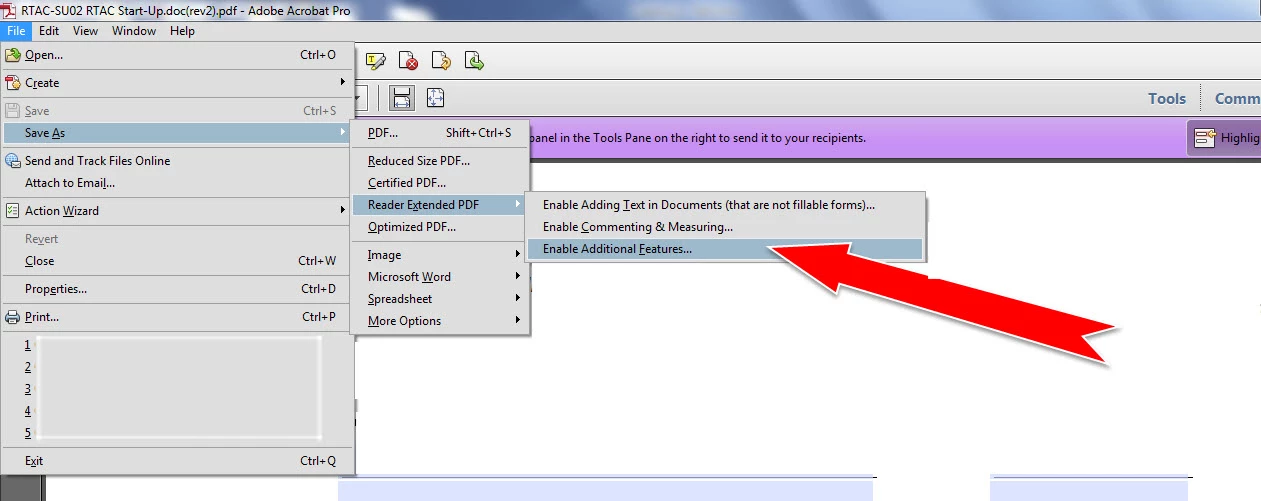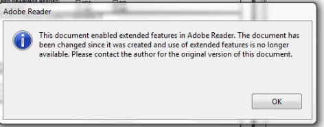 Recently some of the forms created have an error of, This Document Enabled Extended Features in Adobe Reader. The document has been changed since it was created and use of extended features is no longer available, Please contact the author for the original version of this document.