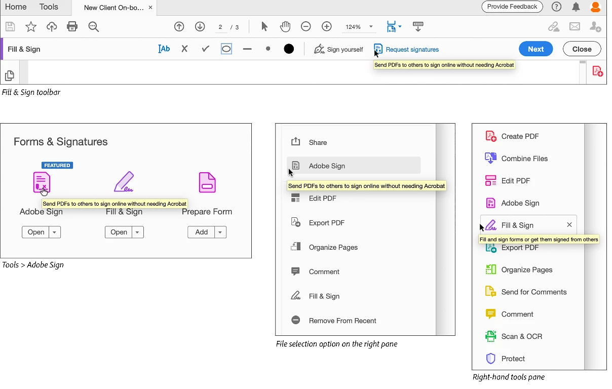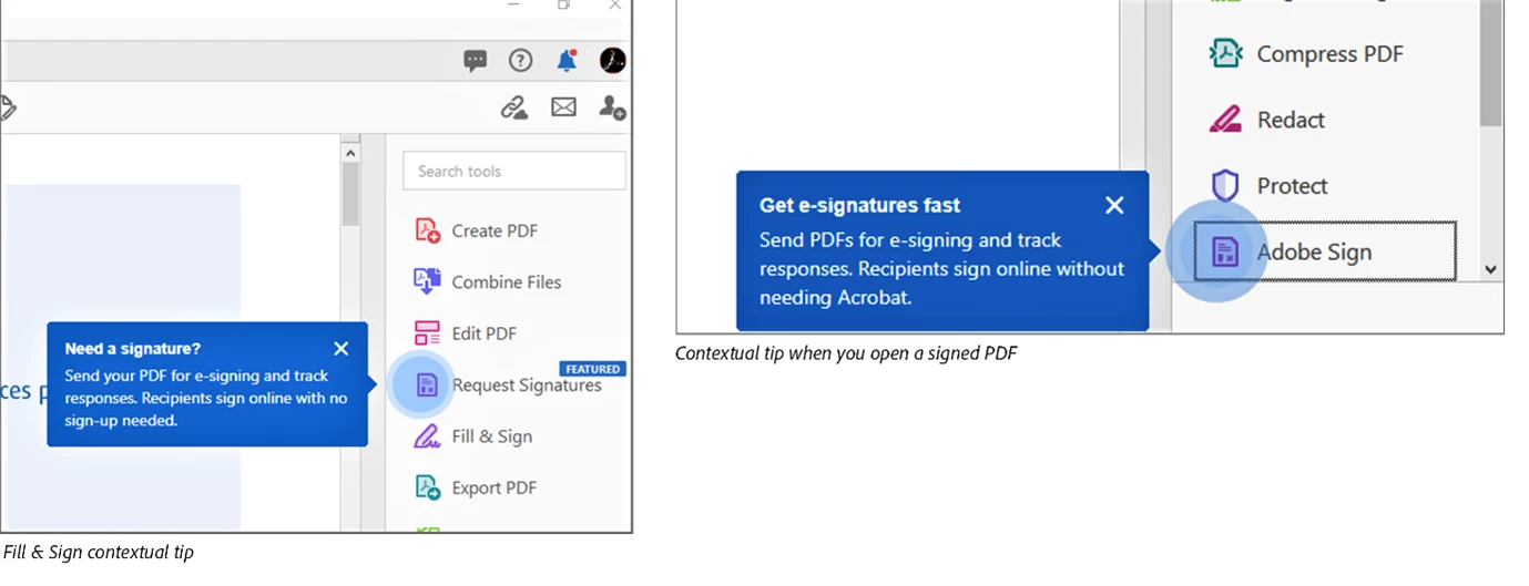 The Fill & Sign or Adobe Sign tooltip now clearly indicates that recipients don't need Acrobat and can sign the documents online.