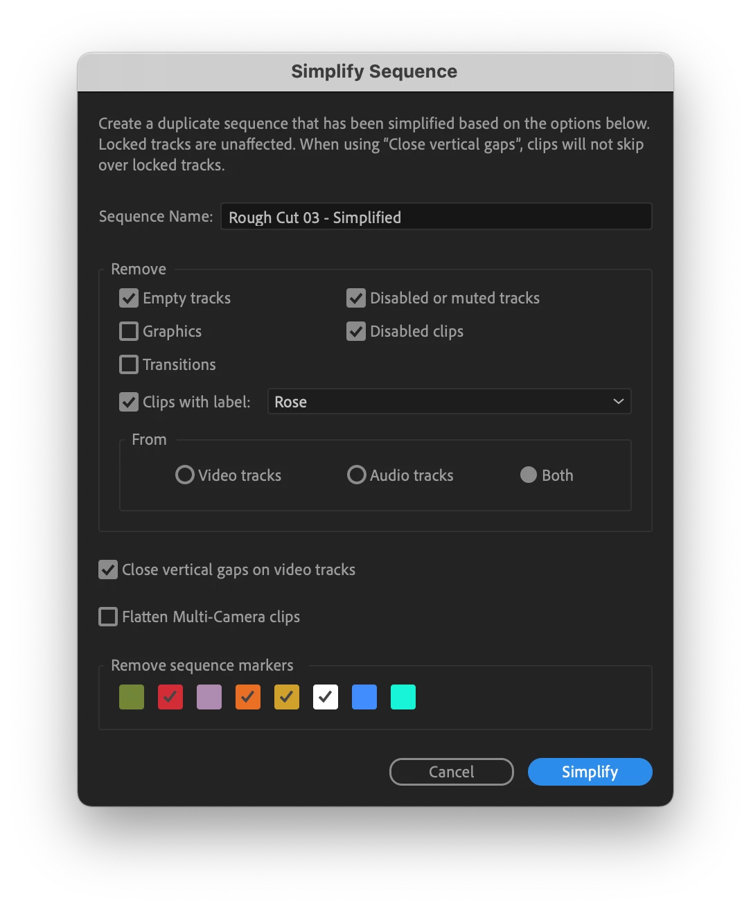 Use Simplify Sequence — new in today's Premiere Pro (Beta) build — to make a copy of your sequence that has been simplified based on options you choose. Simplify Sequence is perfect for when you want to clean up your timeline to focus on your story. It’s also great for sharing your sequence with another editor or preparing it for export via EDL, XML, or AAF.