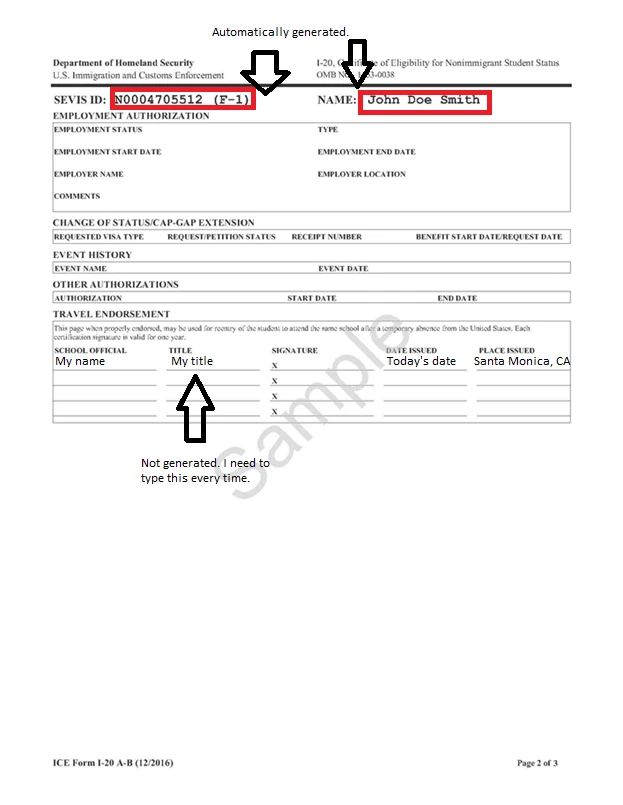 I regularly need to work with PDF documents that are generated by a government website with almost all of the required information. Most of the information is populated onto the document for the specific student that the document is being issued for, but some of my information as the official endorsing the form is not automatically populated. (See below for an example and please forgive my rushed paint job.)