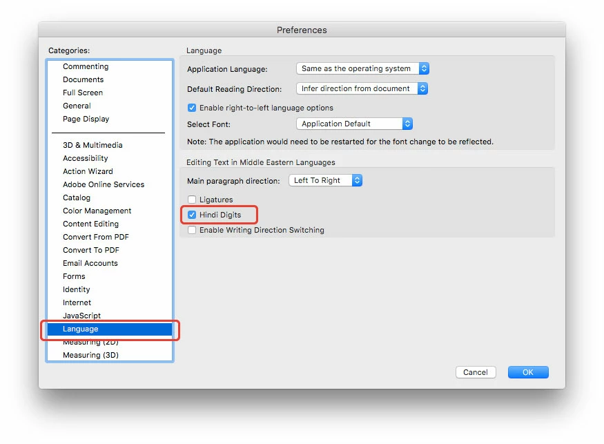 If you're referring to the numbers ١٢٣ in Acrobat, then all you need to do is turn "Hindi Digits" on in Acrobat preferences as shown below…