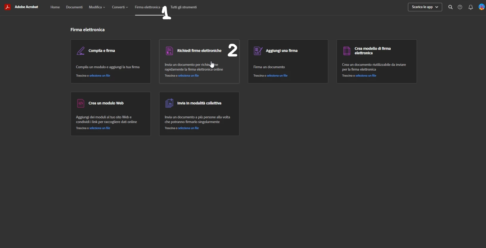 Then click on "Electronic Signature" (1) and then on "Request electronic signatures" (2):