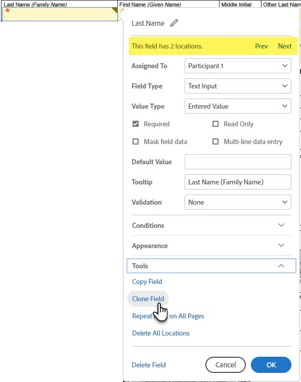 Additionally, at the top of the field properties, you will see the number of field clones that exist, with a handy Prev || Next option that will cycle you through those cloned fields.