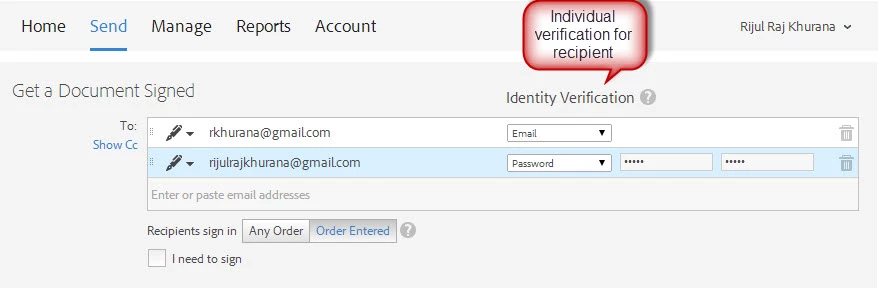The sender can assign individual signer’s identity method in Send page while sending the document Out for signature through EchoSign.