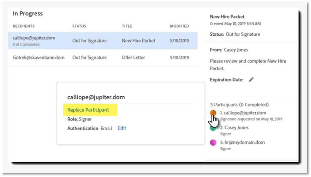 Note: This action only replaces the current signer of the agreement. If you need to change a signer that is later in the process, wait until it is their turn to sign.