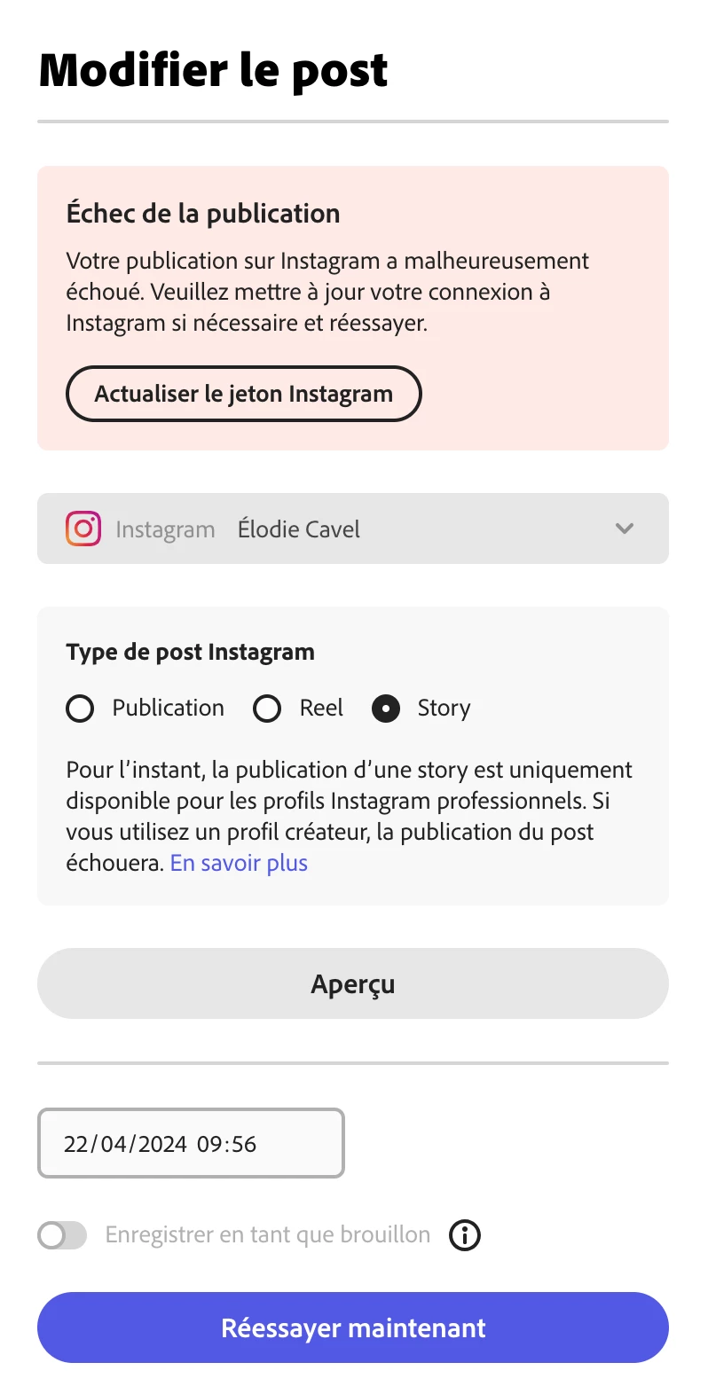Adobe express - Instagram stories scheduled fail to post