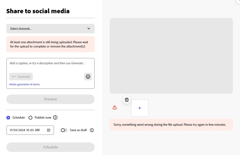 I have been receiving the error shown in the screen shot below for the last two days every time I attempt to upload media to a post in the Adobe Express Scheduler.