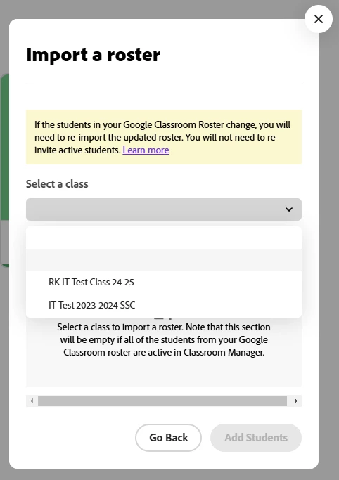 - Under Select a Class you may see some but not all or no classes in the dropdown list.