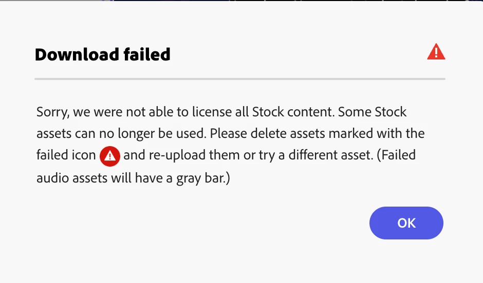 I have looked at every asset and no matter which asset I check there are absolutely 0 assets with that error icon on it. I have an enterprise license with all Adobe Stock licenses from my college. It makes no sense why I cannot download my content, thanks for the help. If anyone knows a fix please tell me, thanks