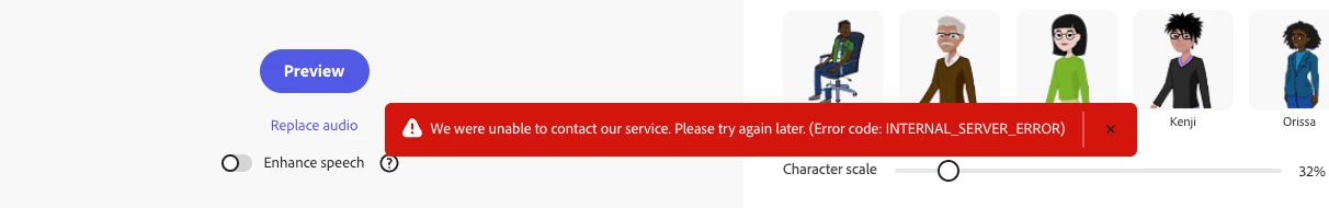 Can anyone support with Animate from Audio... Been trying to record a 30 sec voice piece for the last week and just keep getting an "Unable to contact server" error message. Any fix? thanks