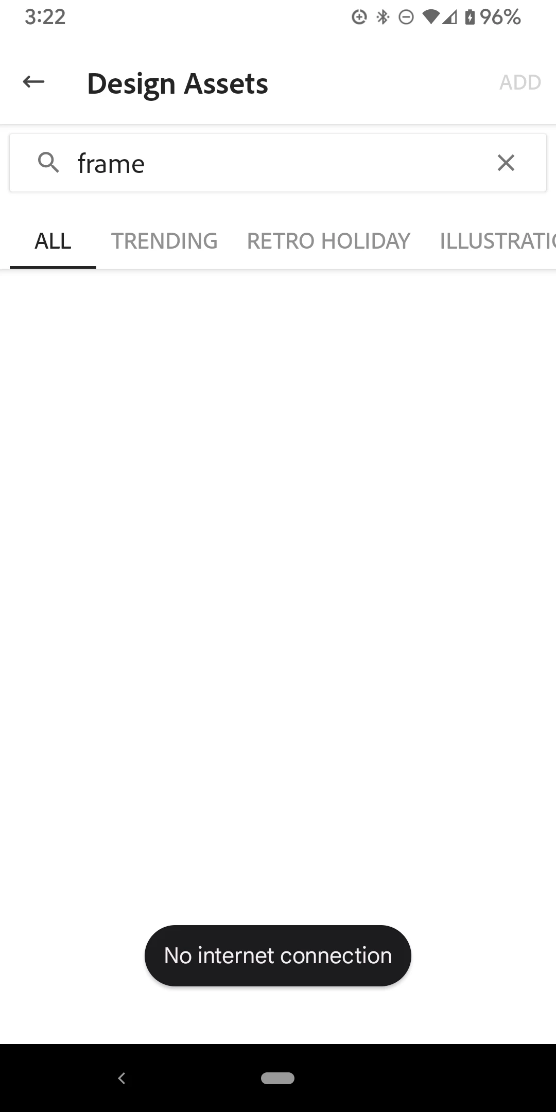 I obviously have an internet connection because nothing else is telling me this and I can continue to work on the project, just as long as I don't search for or apparently use, any design assets.