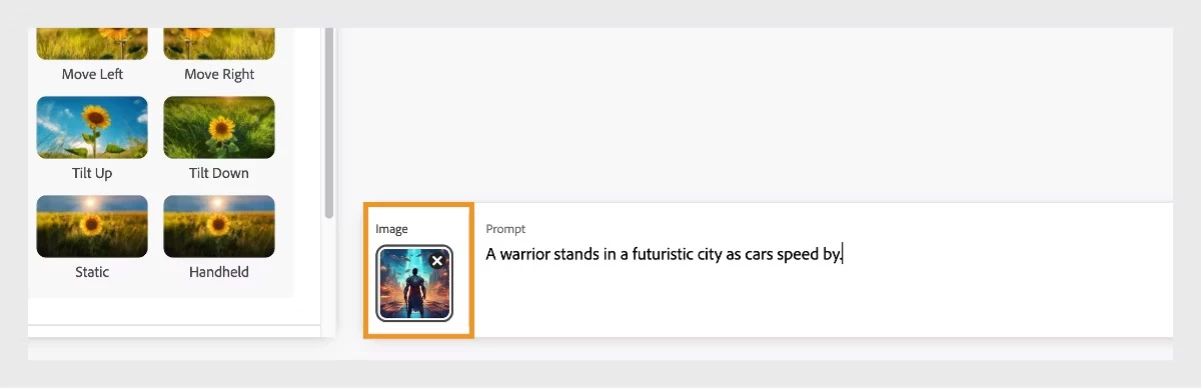 If an image is uploaded in the prompt bar, the Camera angle and Shot Size options are disabled. The camera angle will be derived or used from the uploaded static image. |