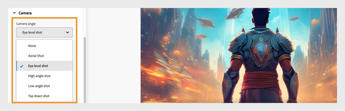 - Use the Camera angle dropdown menu to select from the available options such as Aerial shot, Eye level shot and more.