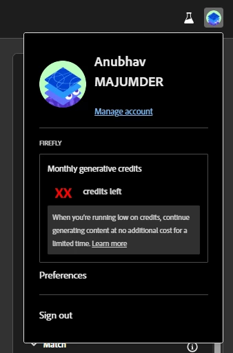 Thanks for reaching out. You may find out the number of generative credits in your account by clicking on the profile picture at the top right corner of the screen when using Firefly.