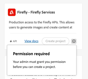 I only paid for Firefly when creating my account. I try to follow these steps https://developer.adobe.com/firefly-services/docs/guides/get-started/, creating a project and then adding the Firefly services API. However, when I try the API seems unavailable. Looking for the API on the catalog, it shows this message: