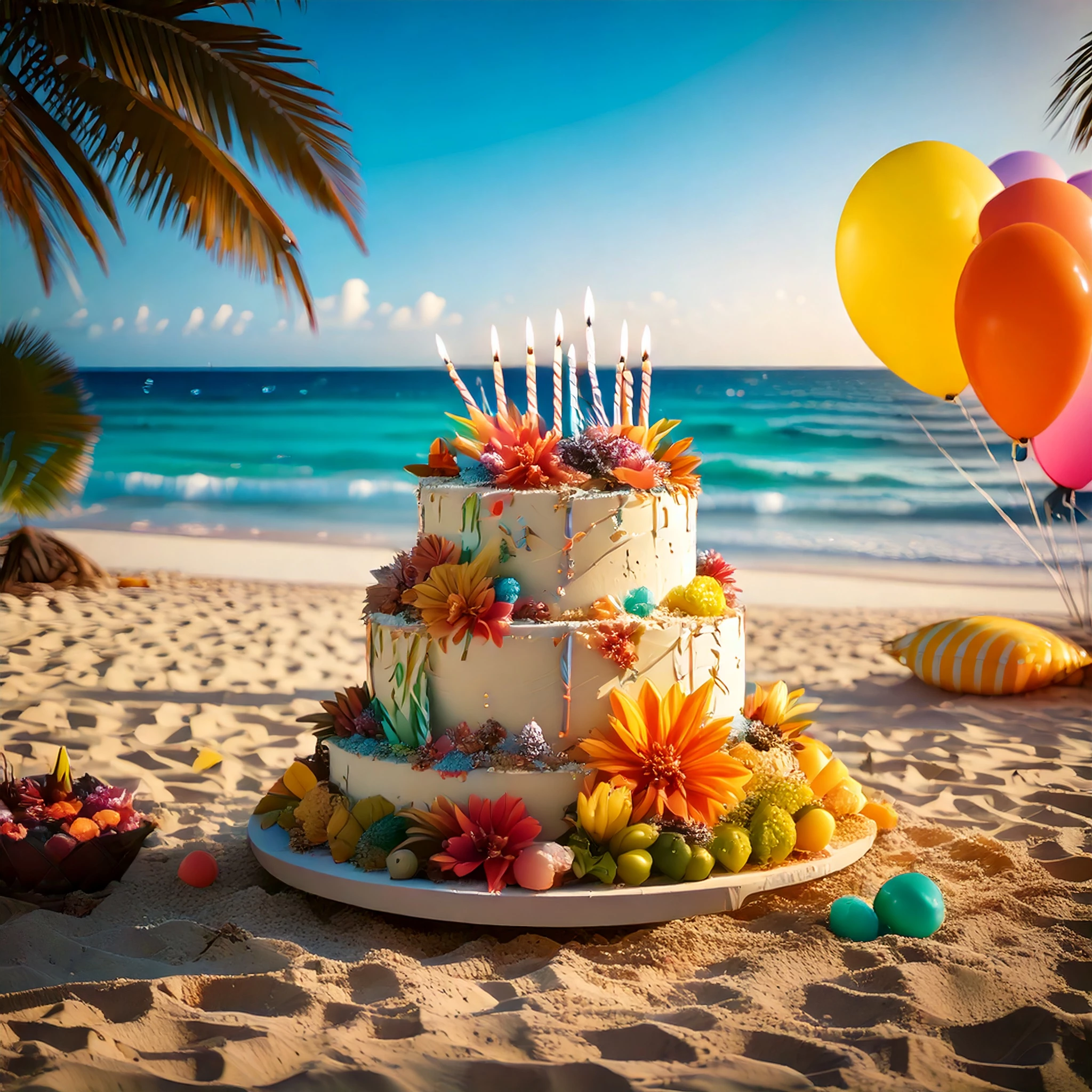 The Prompt I used: Illustrate a tropical beach birthday party with a sandy shore, palm trees. There’s a large birthday cake decorated with tropical flowers, Colorful beach balls make the scene lively and fun.