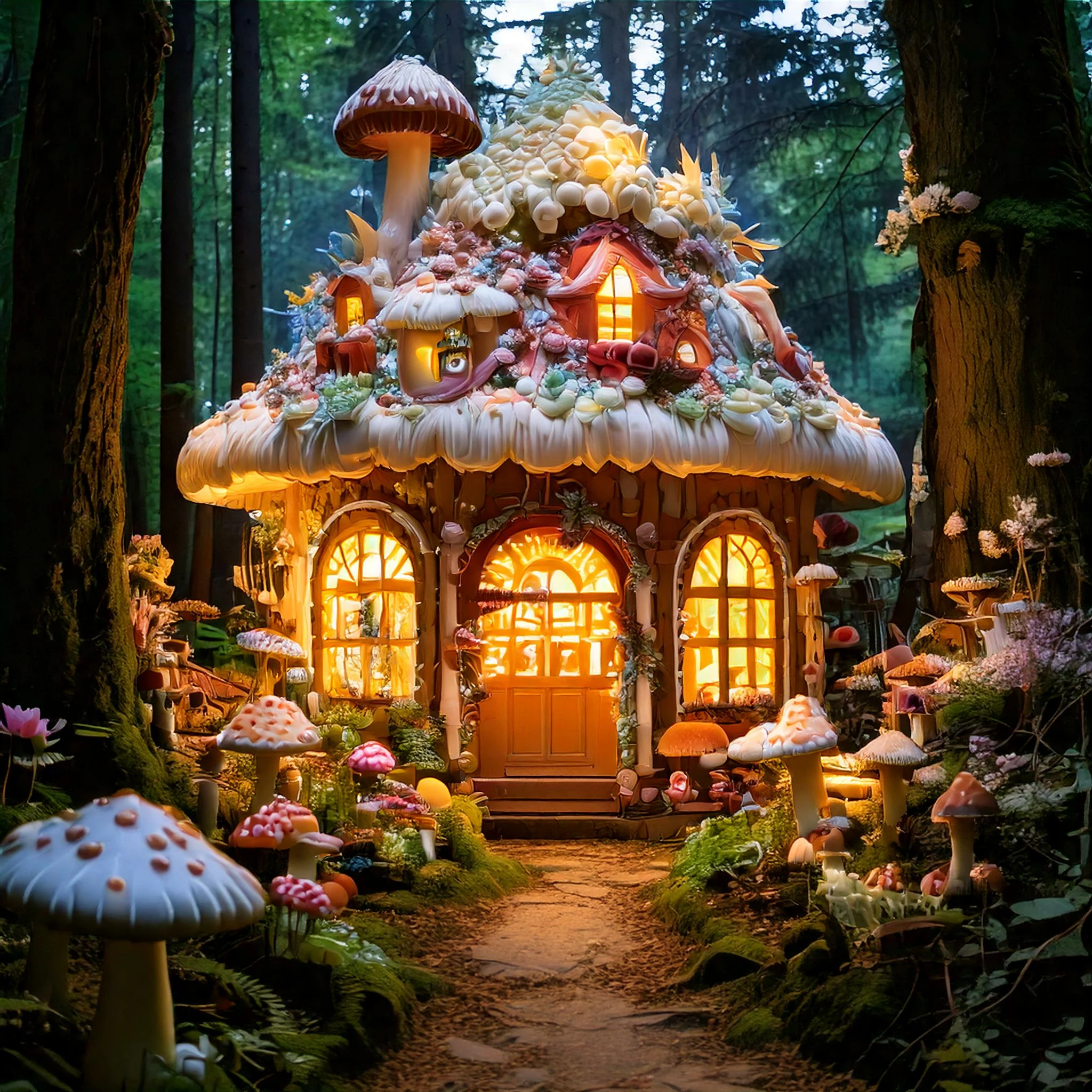 The Prompt I used: An enchanting bakery hidden in a magical forest, with trees and frosting-covered mushrooms. The bakery is surrounded by glowing cupcakes and sugar-dusted flowers, with streams of honey flowing through the scene