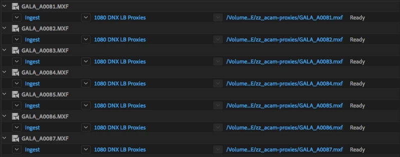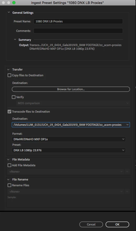Right now, I'm working with footage from a Sony FS7 footage shot in 4K AVCHD, trying to create 1080 DNX LB proxies. I've imported my footage from my media onto my hard drive, and then I want to create proxies on that hard drive, so I created this ingest preset...