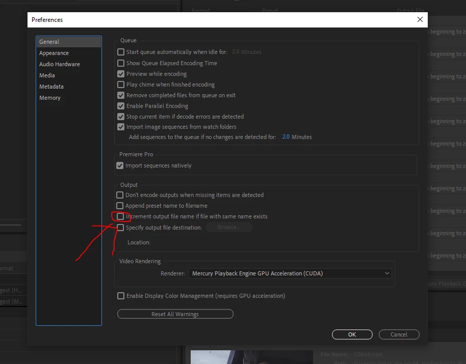 Is there any way to prevent Adobe Media Encoder from adding a _1 to my clip names when I change the transcoding destination of all clips in my queue? Or is there a better way to change the destination folder without tweaking the preset? Clicking the output file path only opens the destination folder in Finder.