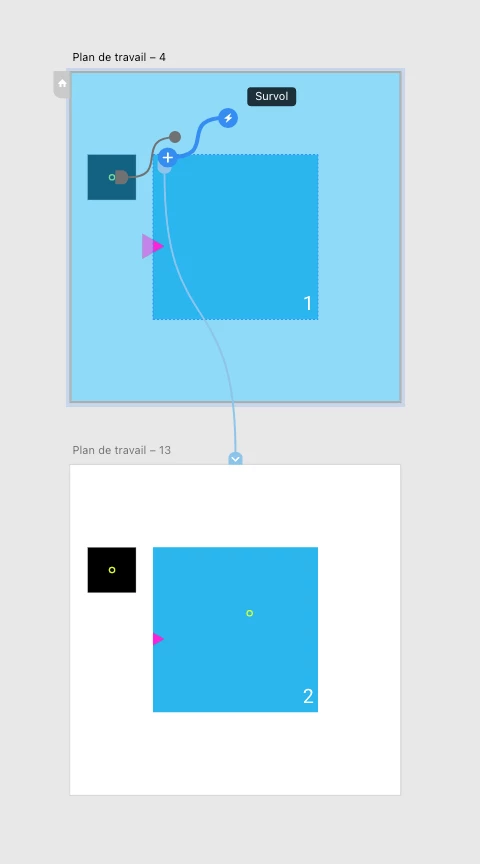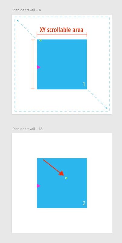 the two artboards explain the objective : while green and pink objects are snaped on the scrollable map and follow the map, the purpose is to move the green component on the map