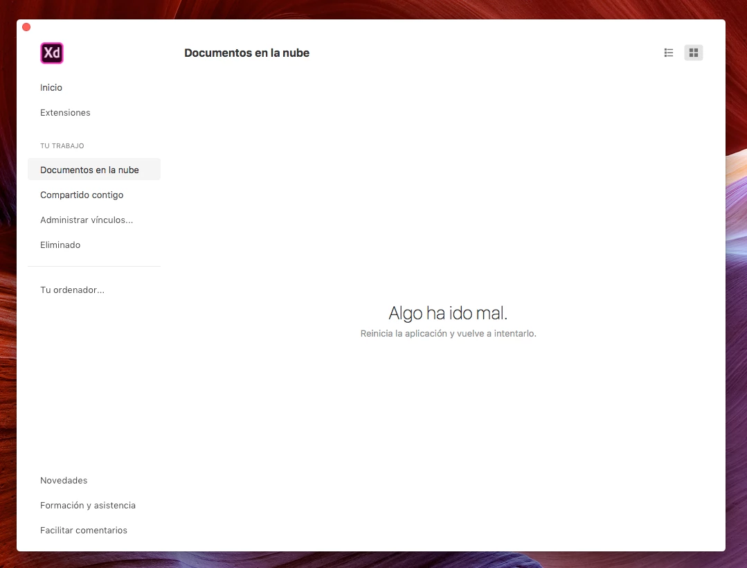 in xd the "documents in cloud" show me this message, i closed the app and reopen and is still.