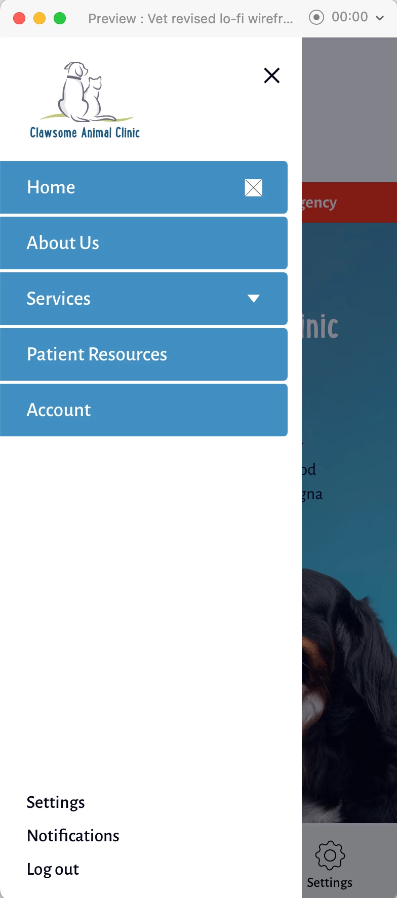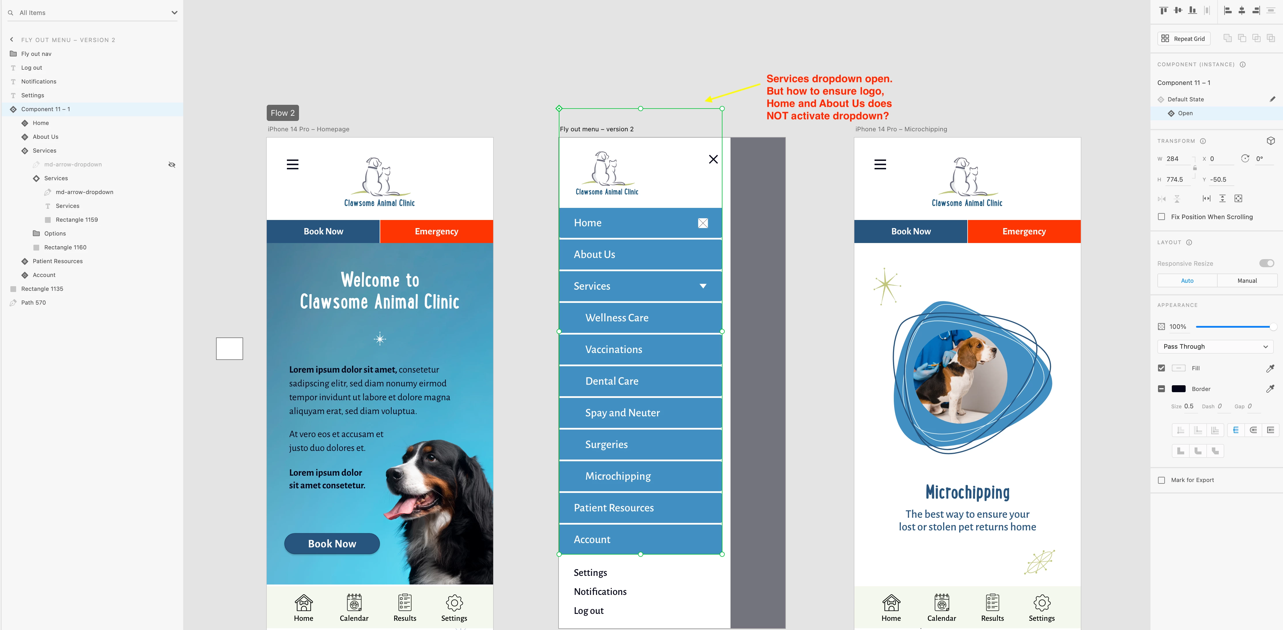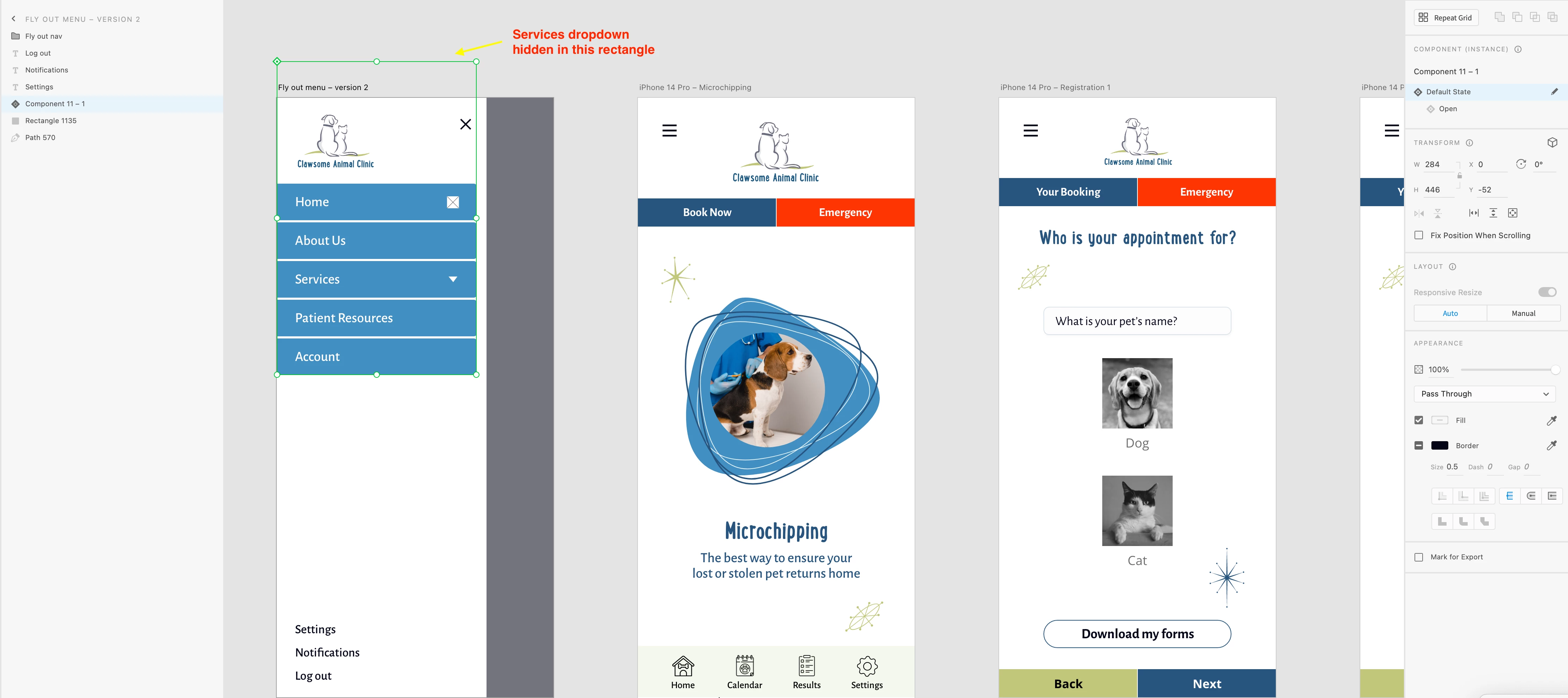 Hello, all. I'm trying to create my first hamburger dropdown in XD. I've hidden the Services section behind the sections above it (nav, Home, and About Us sections.)