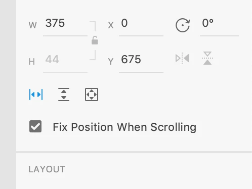 In my design, I want this to be a fixed UI element that stays fixed at the top or bottom of the screen while the rest of the content scrolls by. So I'm expecting the scroll group to horizontally scroll because I've checked that option, AND I'm expecting the group to be fixed in position because I've selected that option. My expectation of this outcome is reinforced by the tool UI because selecting one option does not disable or unselect the other: