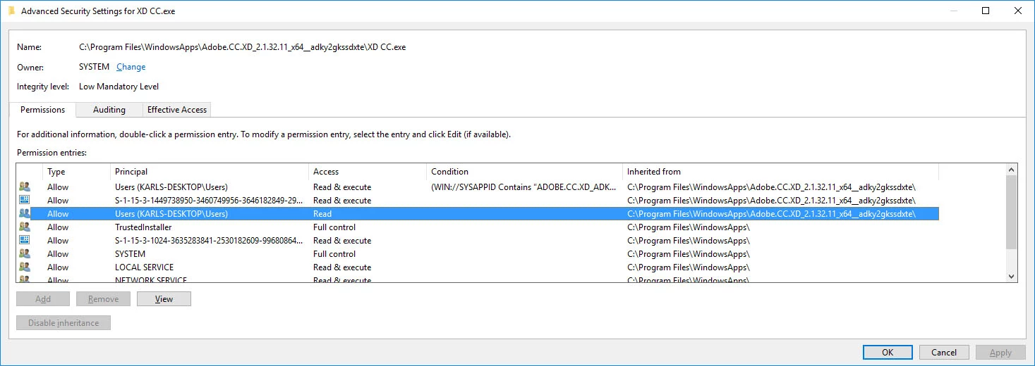 I inspected the permissions for the .exe and it looks like there are two different sets for me as the user, one that allows reading and executing, and one that only allows reading. This should be visible in the screenshot below, but the forum really fuzzed it up for some reason (it's only a 200KB file). Windows won't let me change the permissions for, or remove, the extra user. Has anyone encountered this? Any tips? Thanks.