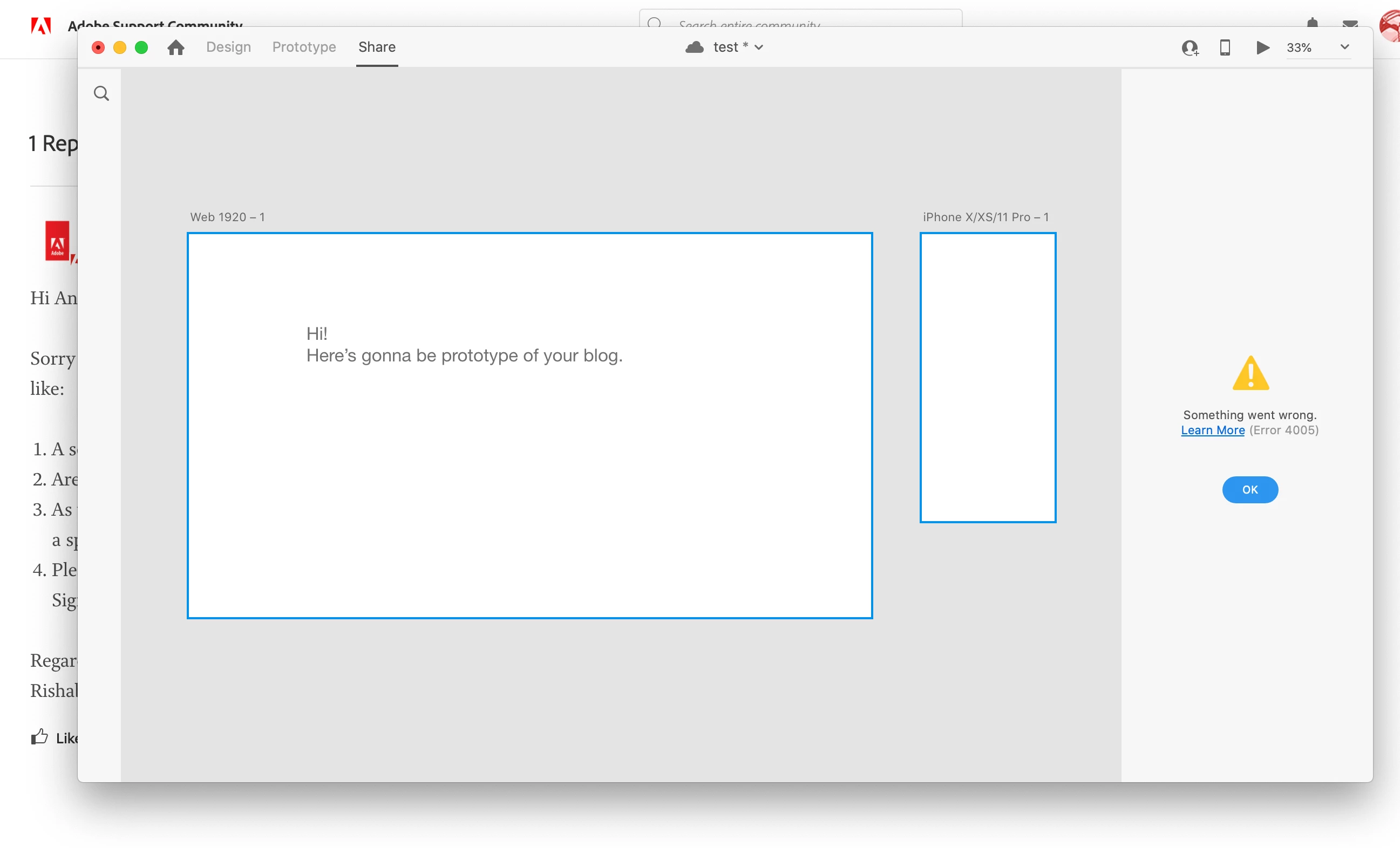 I've just installed Adobe XD on my laptop (new Max OS X). Created first artboard and tried to share it just to test whether it works already. And receive all the time the following error: