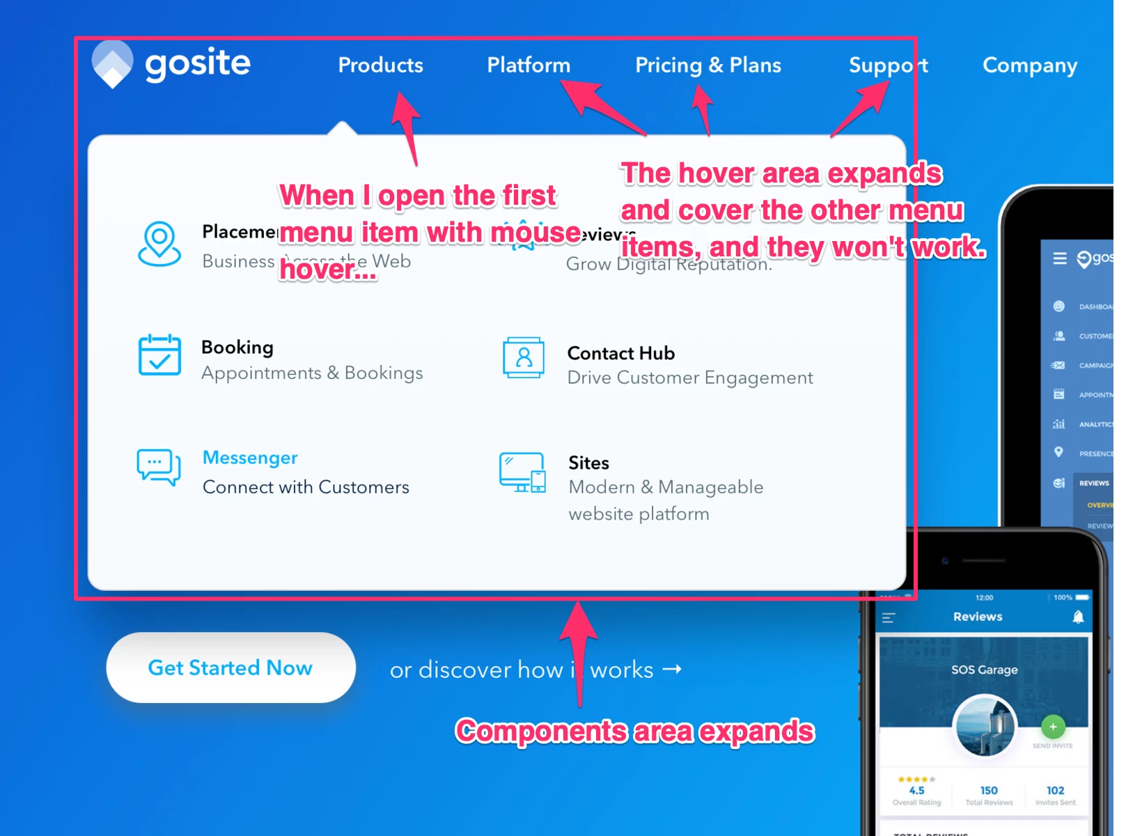 When I hover over the item, the hover area expands and it covers the next item. Then the next item won't work when I move the mouse to the next.